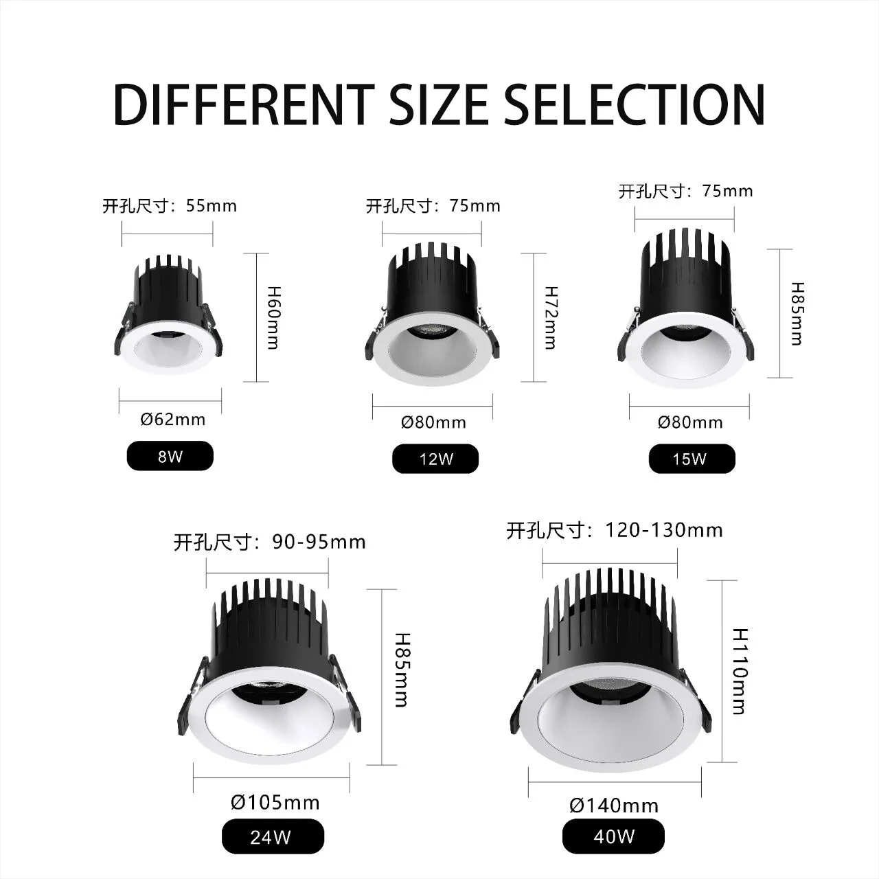 High Quality 15W 75mm Black COB LED Spot Down Light Modern Design Aluminum Ceiling Recessed Spot Light for Office Home Hotel